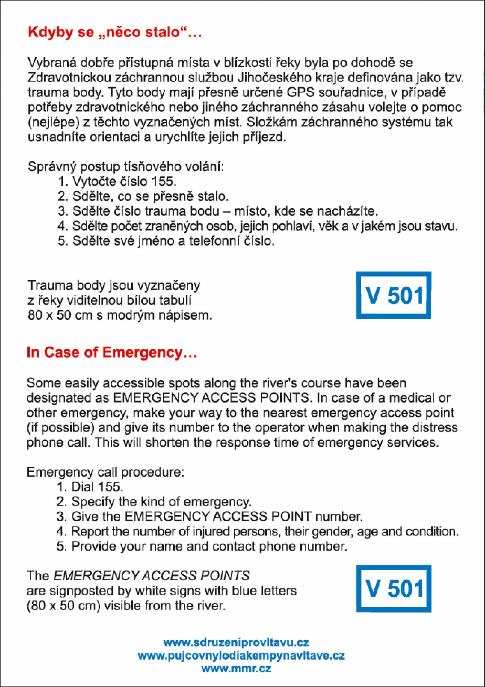 Stejně jako v loňském roce byly při půjčování vodáckého materiálu zákazníkům půjčoven rozdávány kartičky s informacemi o první pomoci a o postupu záchrany z krizových situací.
