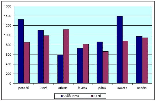Vidíme, že ve Vyšším Brodu jsou velké rozdíly mezi jednotlivými dny v týdnu. Maximální průjezdy v pondělí a v sobotu zhruba dosahují dvojnásobku minimálních průjezdů ve středu a ve čtvrtek. Sobotní maximum zřejmě zachycuje velké množství víkendových vodáků plus ty, kteří během týdenní dovolené hodlají splout větší úsek Vltavy než jen do Českého Krumlova. Pondělní maximum je zřejmě tvořeno týdenními vodáky, mířícími pouze do Českého Krumlova, kteří o víkendu teprve do Vyššího Brodu přijížděli a vyčerpali nabídku aktivit a otevřených památek v tomto městě.