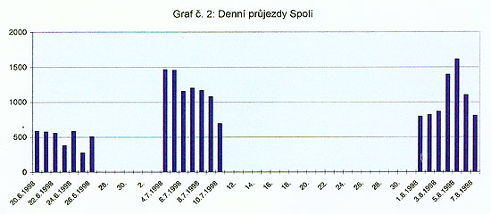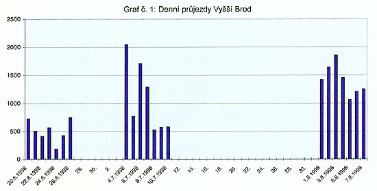 Jednotlivé sloupce v grafech tedy ukazují, kolik osob v daný den projelo kontrolním profilem ve Vyšším Brodu a ve Spolí. Ve Vyšším Brodu bylo denního maxima dosaženo v sobotu 4. 7. 1998, kdy počet osob překročil hranici 2 000. V srpnovém týdnu překračoval počet osob hranici 1000. Ve Spolí bylo denního maxima dosaženo ve středu 5. 8. 1998, kdy počet osob překročil hranici 1600. Celý červencový týden kromě pátku bylo zaznamenáno přes 1000 osob.