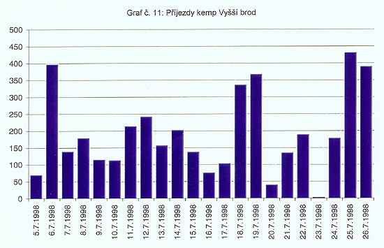 Na vodorovné ose jsou uvedeny datumy, na svislé pak počty osob. Jednotlivé sloupce tak ukazují počty osob, které se v jednotlivých dnech hlásili k pobytu na tábořišti ve Vyšším Brodu.