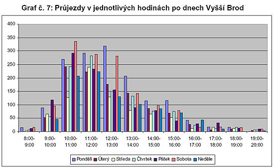 Maxima během dne jsou ostřejší než na profilu Spolí (viz graf č. 8). Je to způsobeno zřejmě tím, že profil Vyšší Brod je velmi blízko tábořiště, odkud mnoho lidí odjíždí téměř současně, jen co stihnou po ránu zabalit, což se víceméně každému podaří do oběda. Později pak jezdí již jen opozdilci, klienti půjčoven a lidé, kteří ve Vyšším Brodu netáboří (během dne přijedou a během téhož dne po řece odjedou).