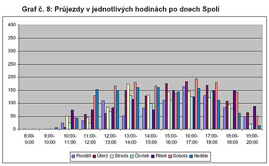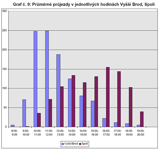 Tyto grafy, resp. údaje v nich pro Vyšší Brod a pro Spolí, jsou vlastně průměrem hodnot uvedených v grafech č. 7 a č. 8, kde hodinové průjezdy byly uvedeny s rozlišením po jednotlivých dnech v týdnu.