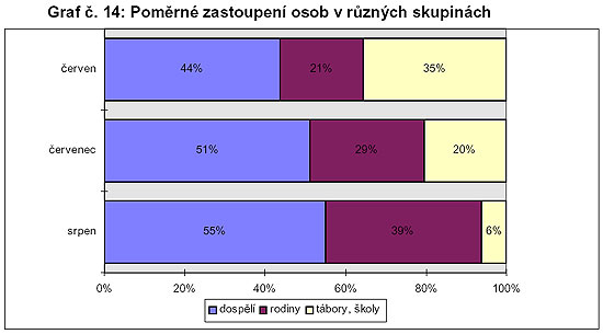 Graf č. 14 ukazuje poměrné zastoupení splouvajících vodáků různých skupin v jednotlivých týdnech, kdy byla prováděna pozorování. Pozorovatelé rozlišovali 3 různé druhy skupin: skupiny tvořené pouze dospělými, skupiny rodičů s dětmi a konečně dětské tábory, oddíly, školy apod.