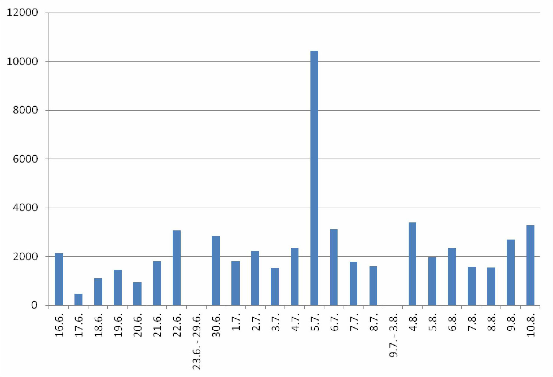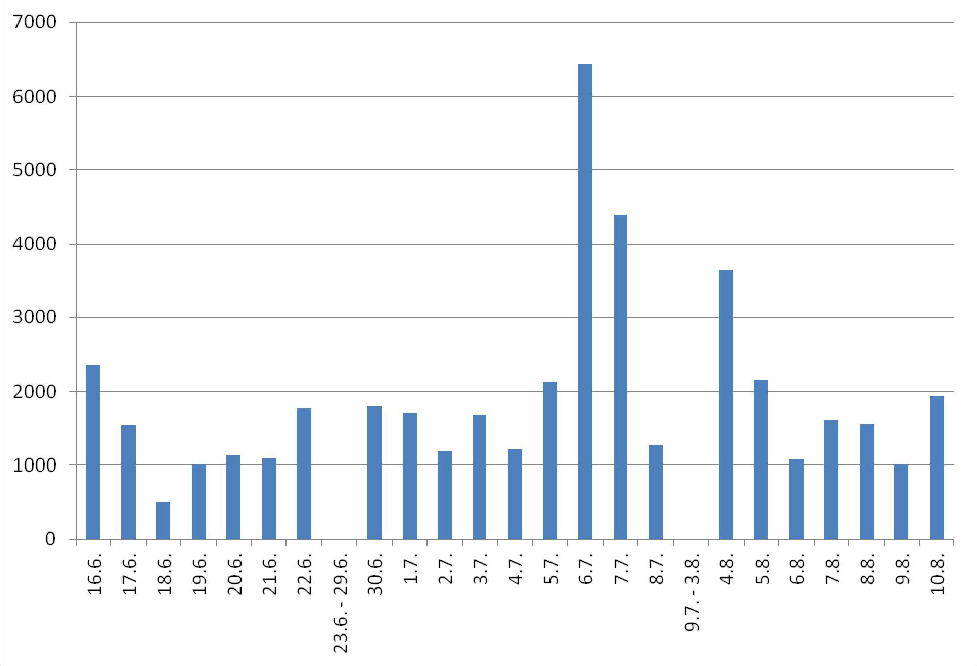 | 30. 6. | 1. 7. | 2. 7. | 3. 7. | 4. 7. | 5. 7. | 6. 7. | 7. 7. | 8.7. | Celkem |